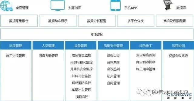 當前項目平臺的功能圍繞人員管理、設備管理、質量安全監(jiān)管、綠色施工、進度管理及多方協(xié)同管理展開,實現對工地現場人員、設備、環(huán)境、流程全要素的信息化,并通過GIS的形式進行展示,實現可視化、智能化的管理。在接入數據的基礎上實現動態(tài)展示、分析預警、并按照工地的組織結構權限進行劃分和設定,實現數據的有效監(jiān)管。項目部可通過桌面應用、大屏、APP及觸摸屏來查詢數據,實現隨時隨地的管理。